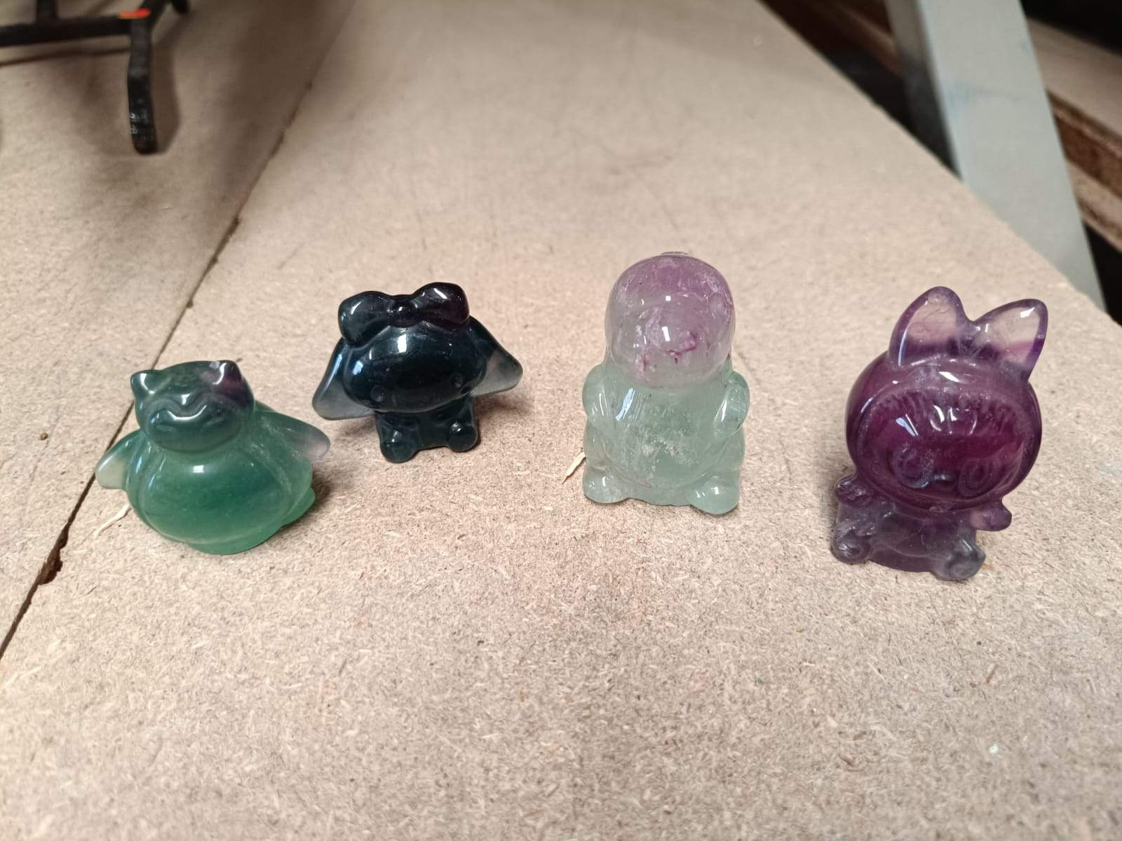 Descubre nuestras encantadoras figuritas talladas en fluorita natural. Cada pieza es única y representa formas de animales, plantas o personajes de dibujos animados, combinando el arte del tallado con los vibrantes colores de este mineral. Ideales como decoración, coleccionables o amuletos energéticos.