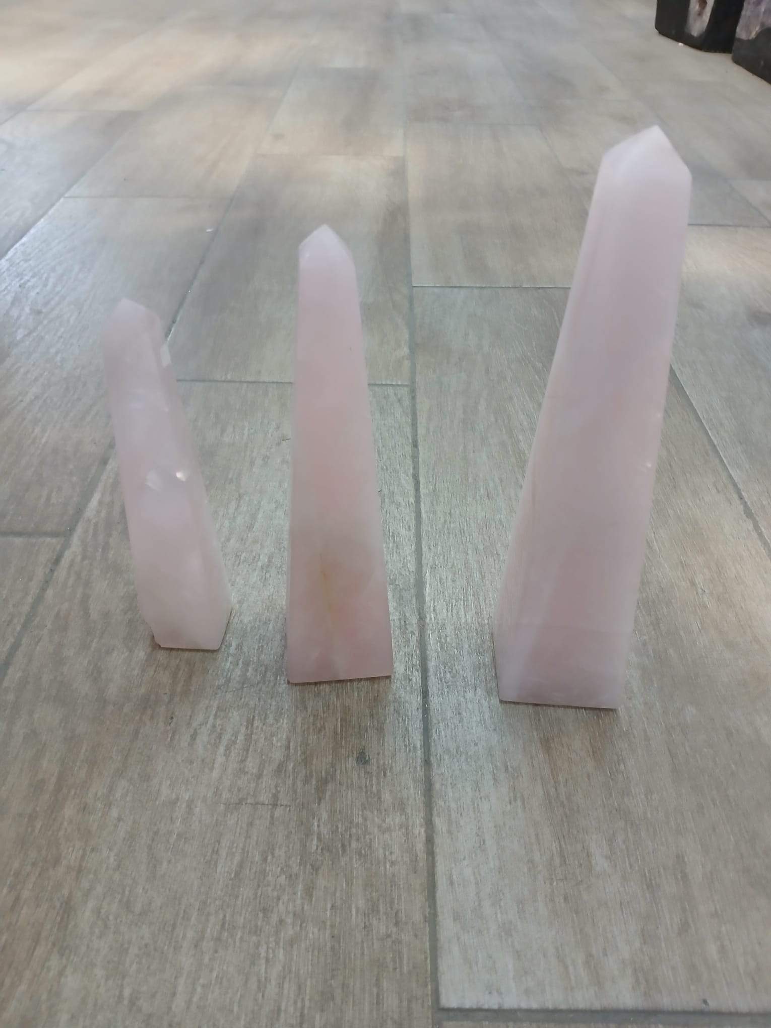 Cuarzo rosa pulido en forma de obelisco. Ideales para decoración, colecciones o terapias energéticas. Venta por kg.»