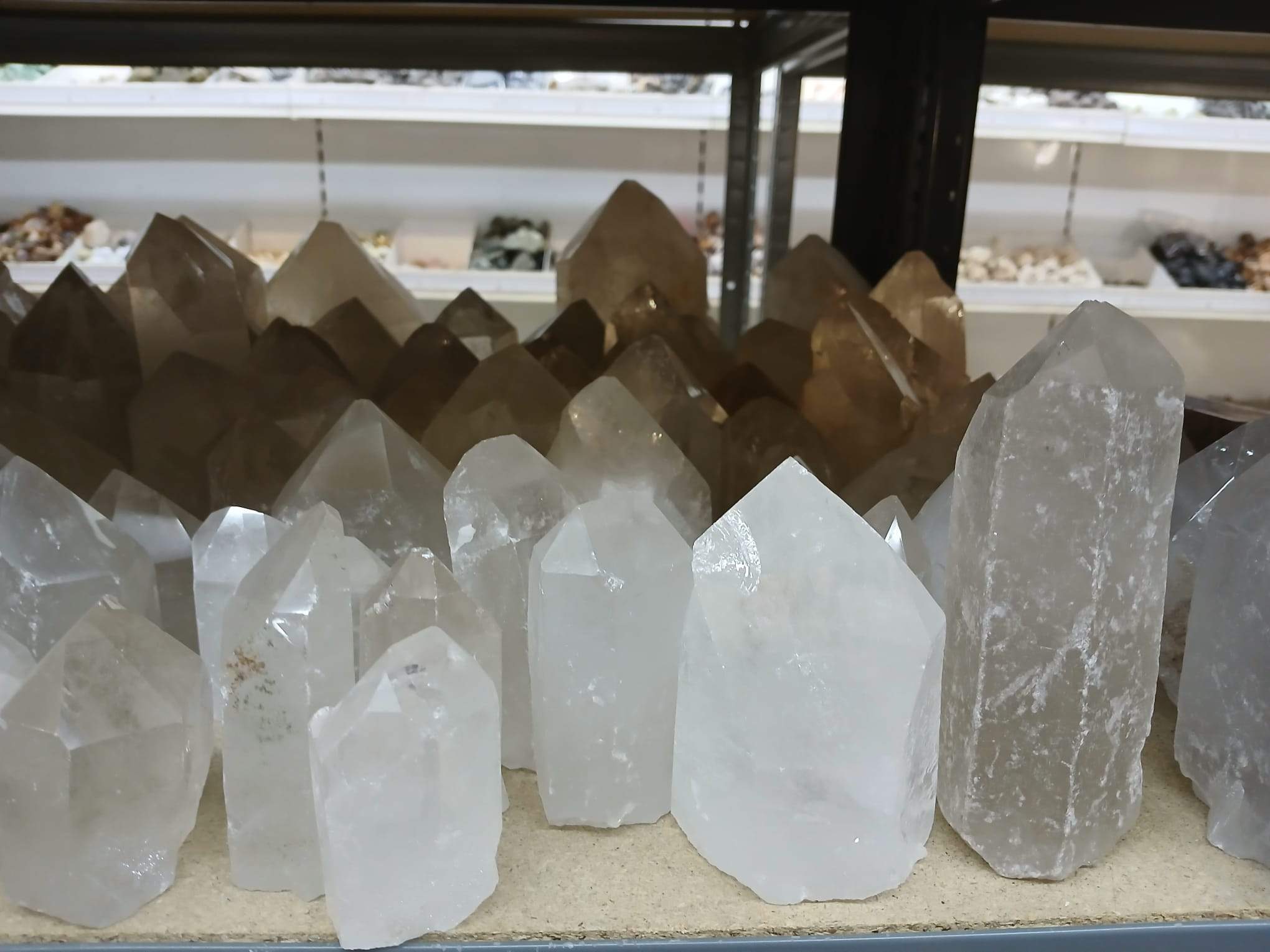 Puntas de cuarzo cristal, con un acabado translúcido y brillo suave. Conocidas por su pureza visual y sus propiedades energéticas de limpieza y armonización. Ideales para decoración, meditación o colección. PRECIO POR KG.»