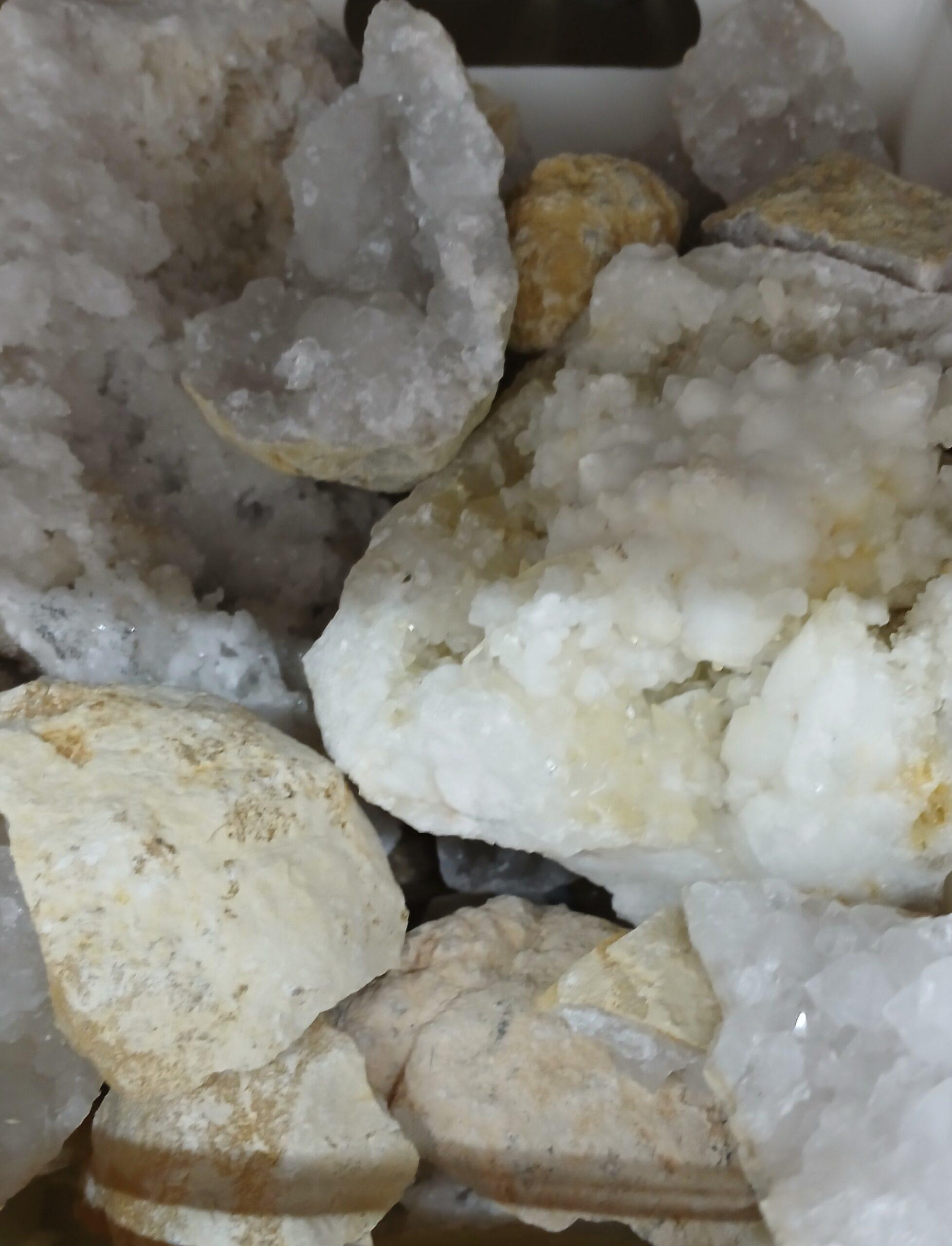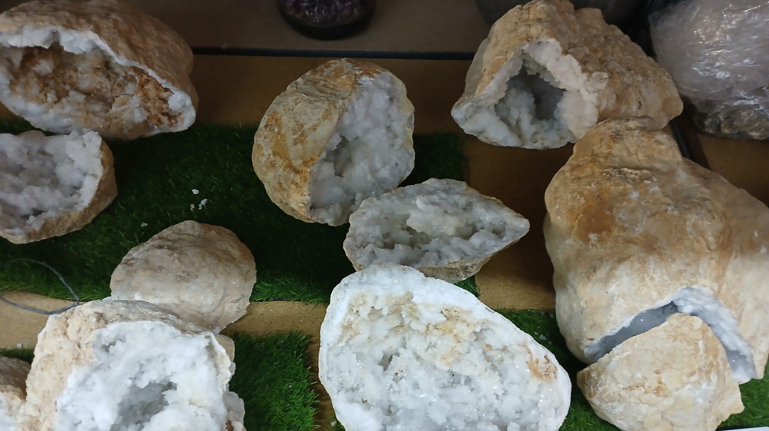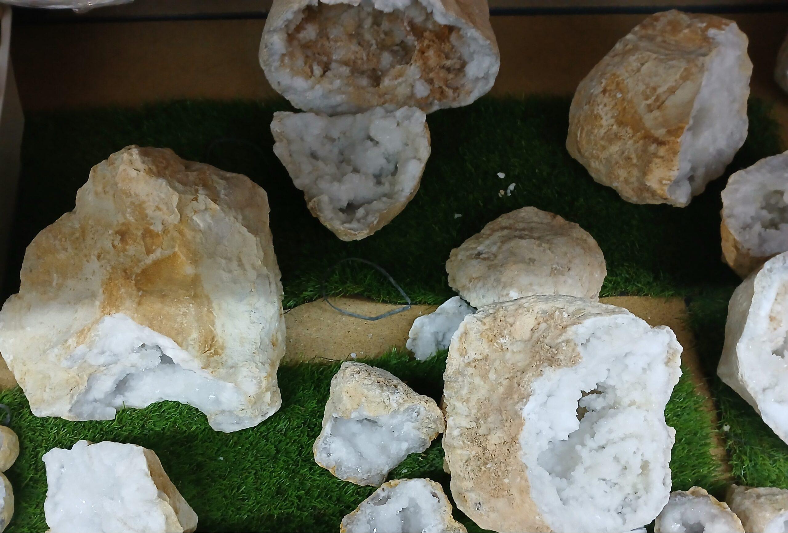 Conjunto de ocho piezas de geodas naturales de cuarzo con cavidades internas repletas de cristales brillantes y translúcidos. Cada pieza es unica, ideales para decoración, coleccionismo o para terapias energéticas y armonizar espacios. REVISAR CENTIMETROS POR DIAMETRO precio/unidad