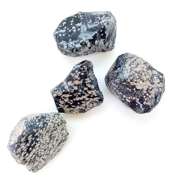 Obsidiana copo de nieve, un vidrio volcánico natural con características manchas blancas que recuerdan copos de nieve sobre su base negra brillante. Valorada por su energía protectora y purificadora, ayuda a liberar bloqueos emocionales y fomentar la claridad mental.