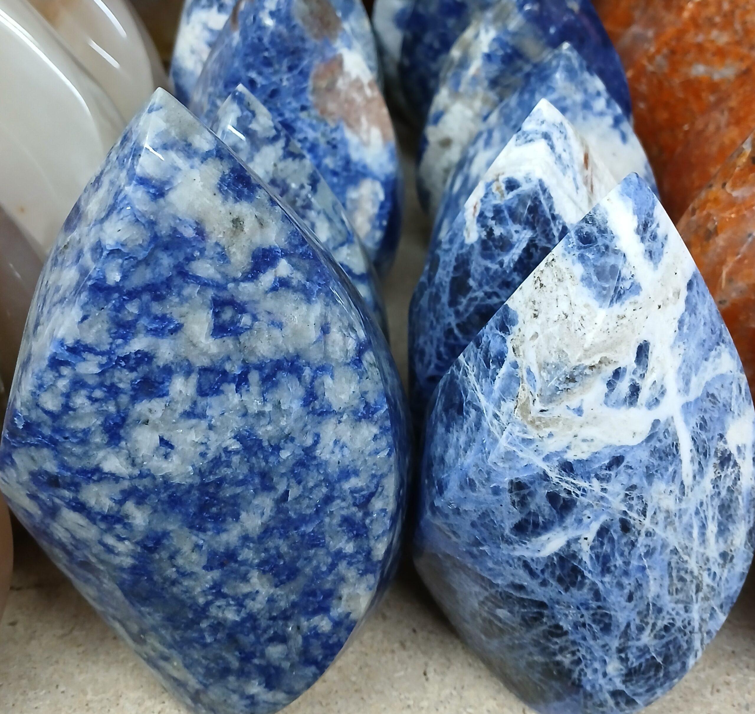 Sodalita pulida en forma de llama. Esta forma simboliza transformación y energía en movimiento, lo que la convierte en una excelente opción decorativa o energética para espacios que buscan protección y renovación.