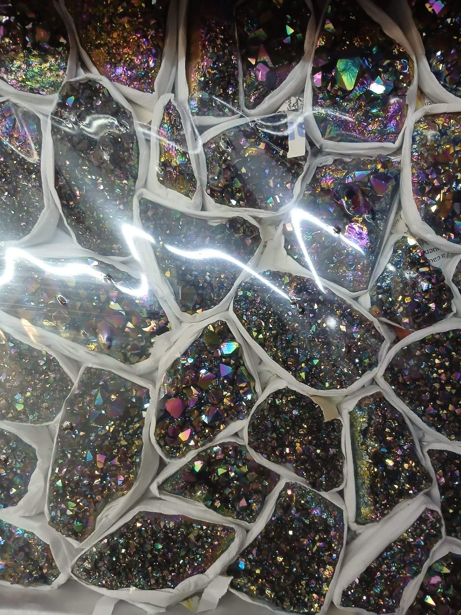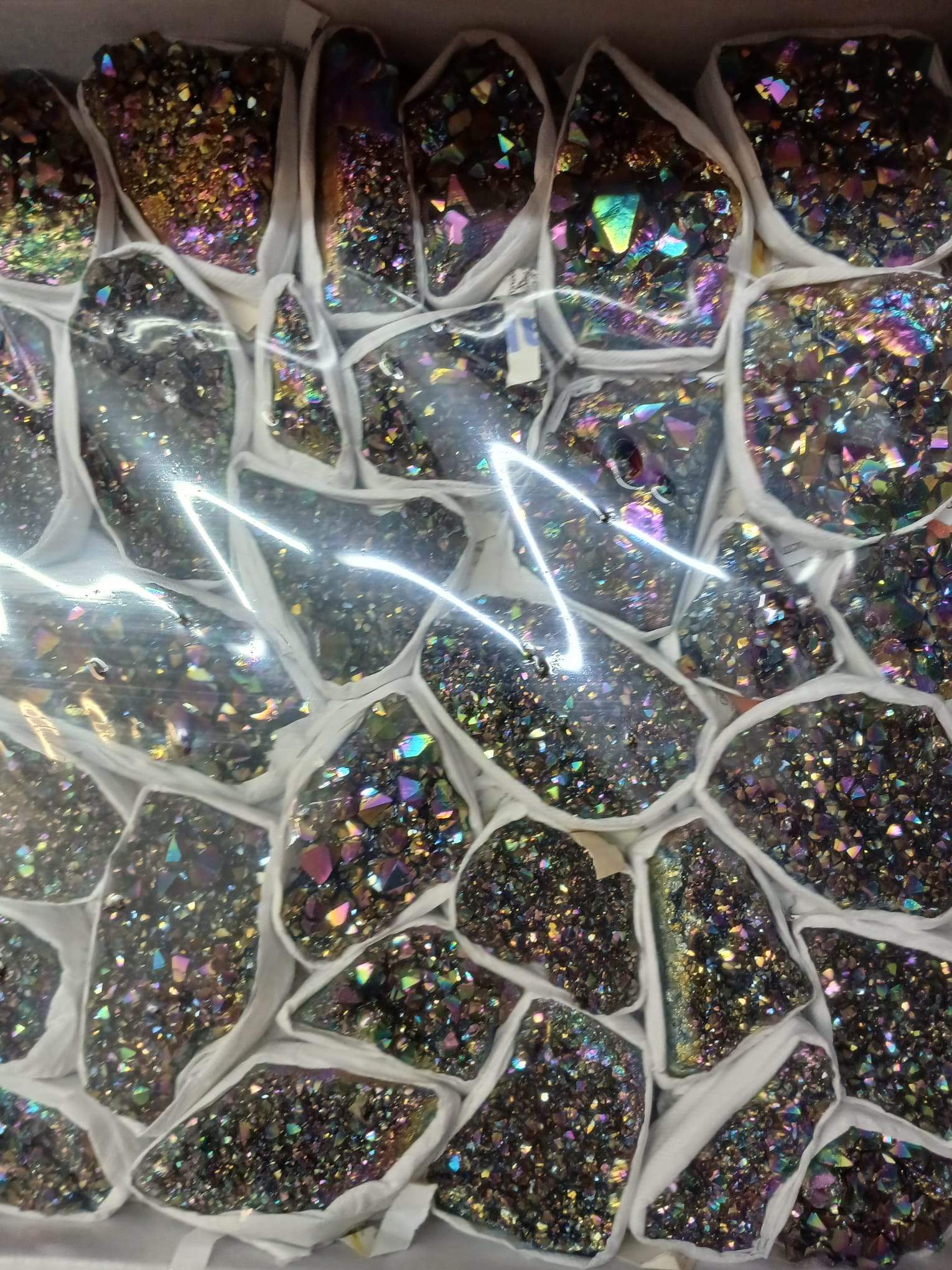 Selección de piezas de amatista natural tratadas con aura de titanio que exhiben un vibrante brillo iridiscente en tonos arcoíris. Combinan la belleza del cristal con una energía renovadora y protectora. Ideales para decoración, colección o terapias energéticas enfocadas en la vitalidad y la armonización de los chakras.
