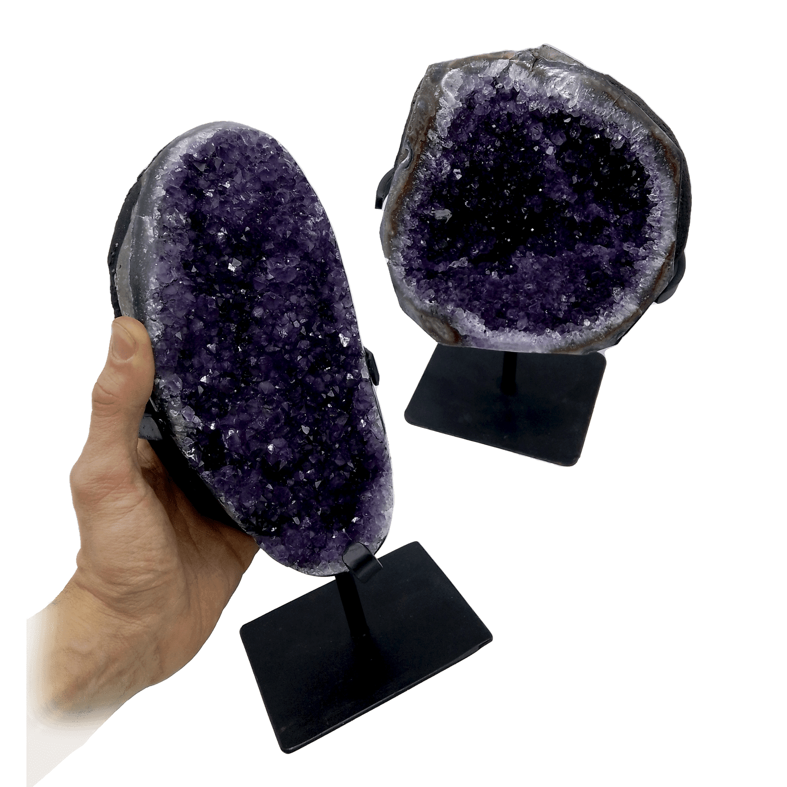 Dusa de amatista de alta calidad montada sobre una base de metal resistente que realza su textura cruda y auténtica. Ideal para decoración, protección energética y espacios.