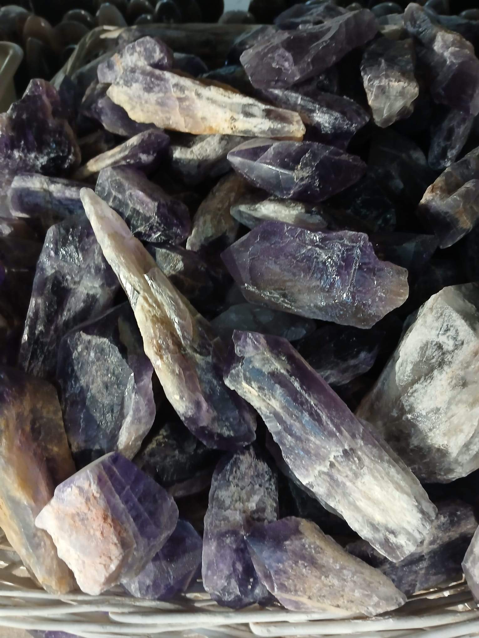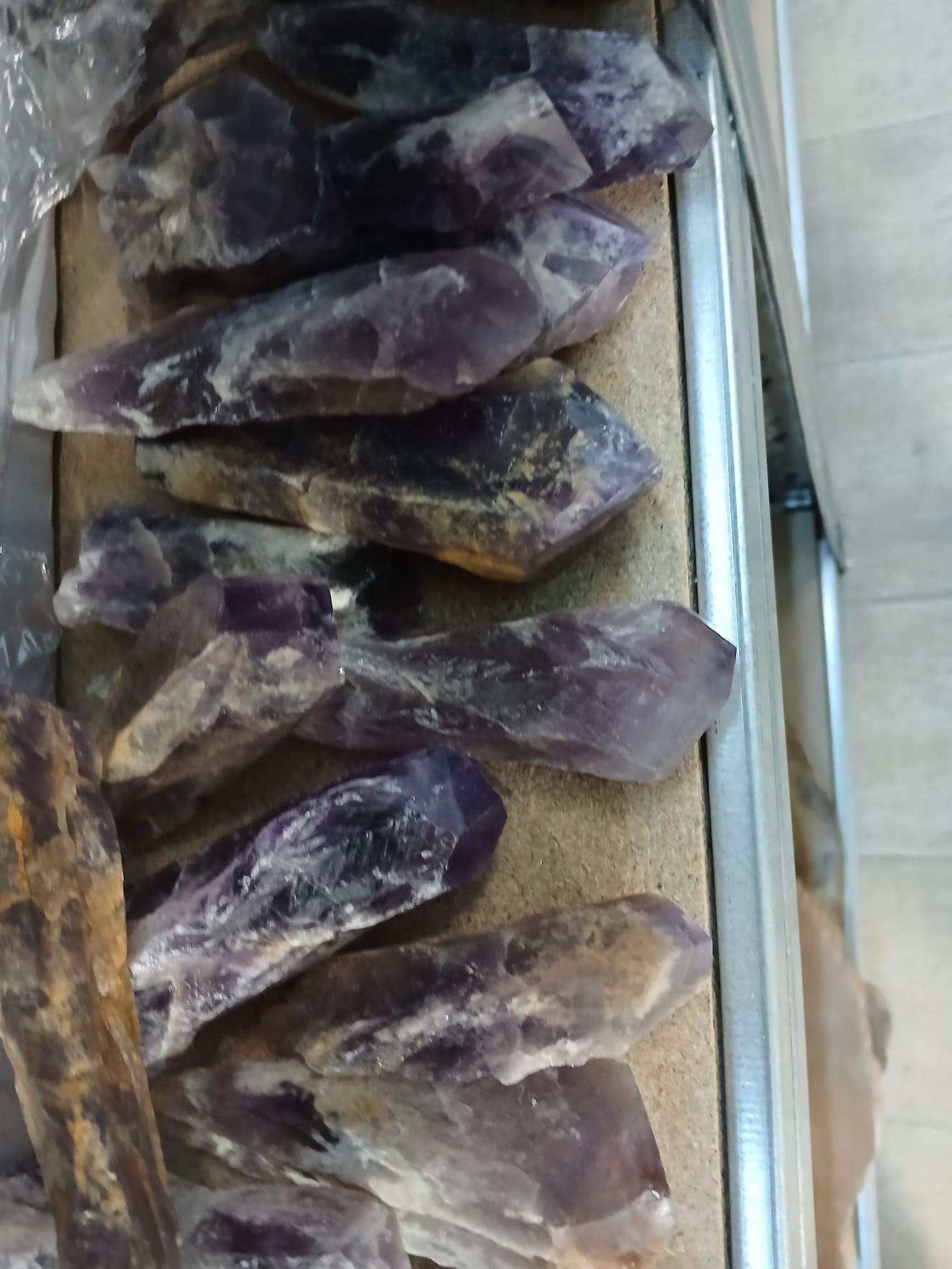 Selección de puntas largas de amatista natural. Presentan tonalidades violeta en distintas intensidades y estructuras cristalinas que reflejan su origen geológico. Ideales para decoración, coleccionismo o uso energético enfocado en la calma, la intuición y la conexión espiritual. venta por kg.»