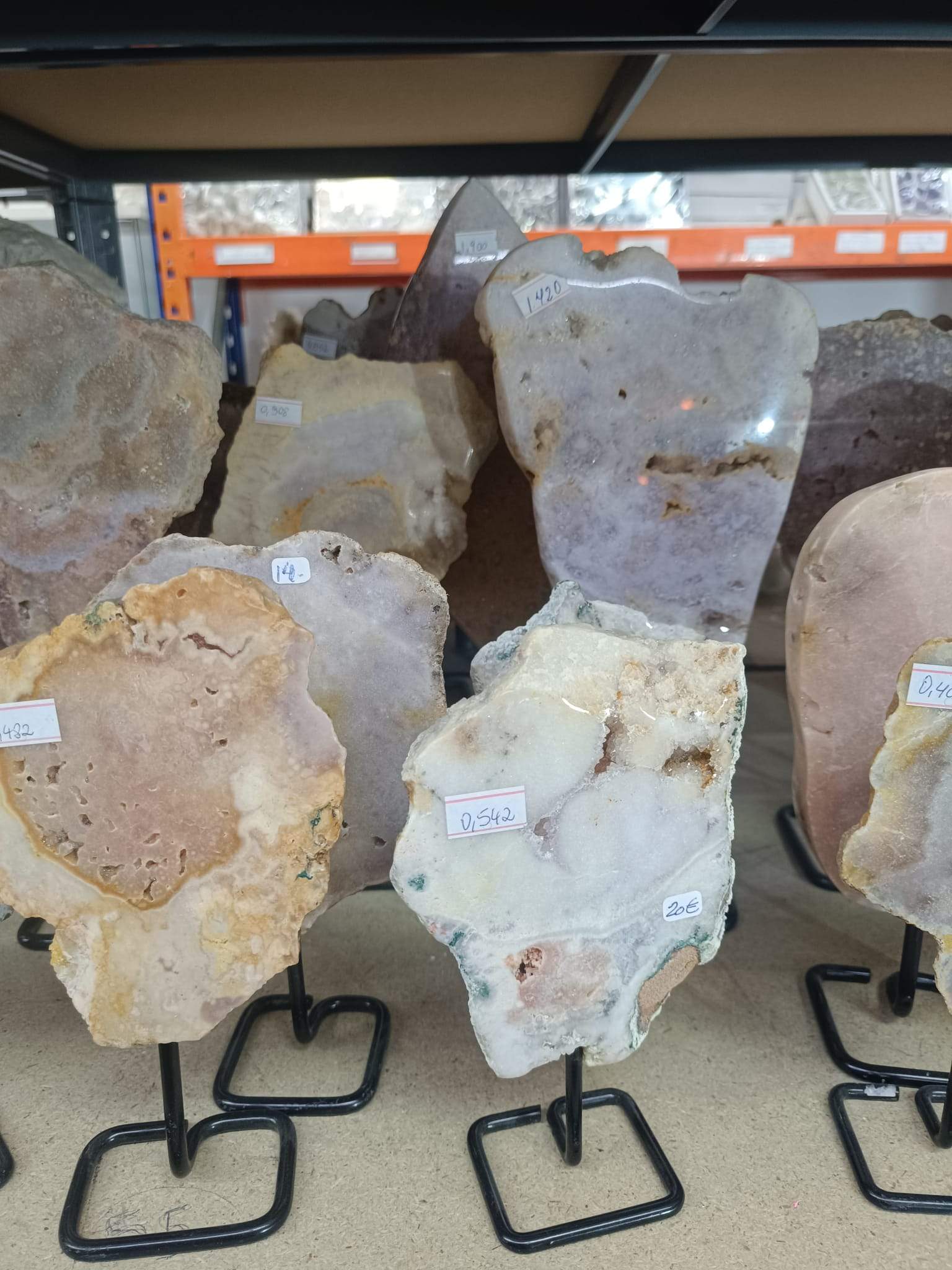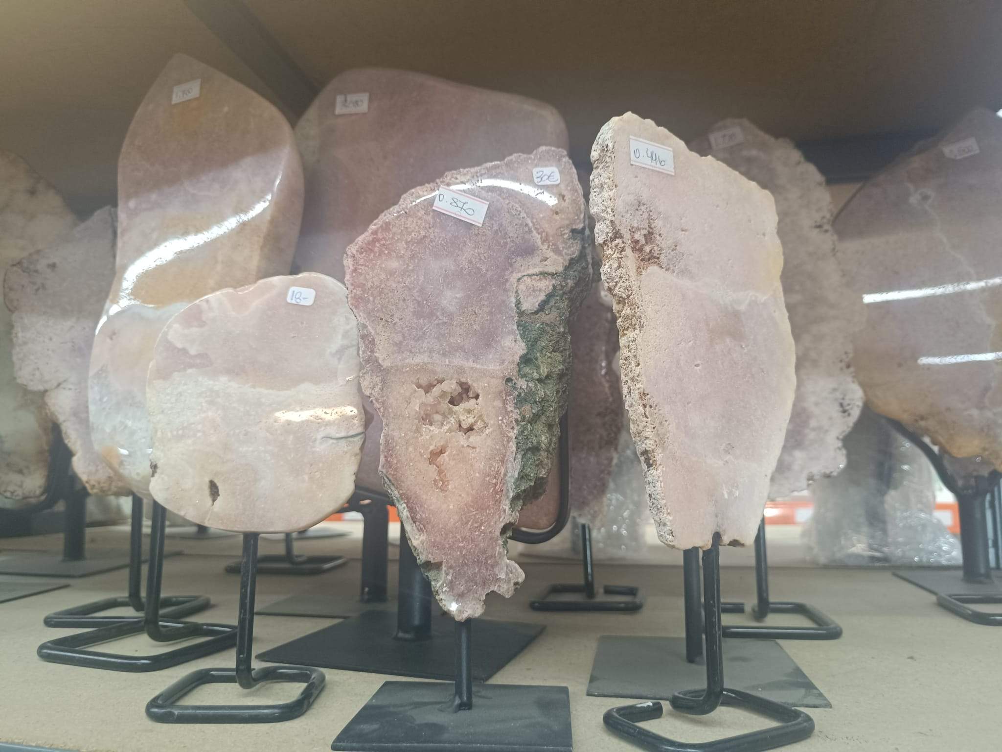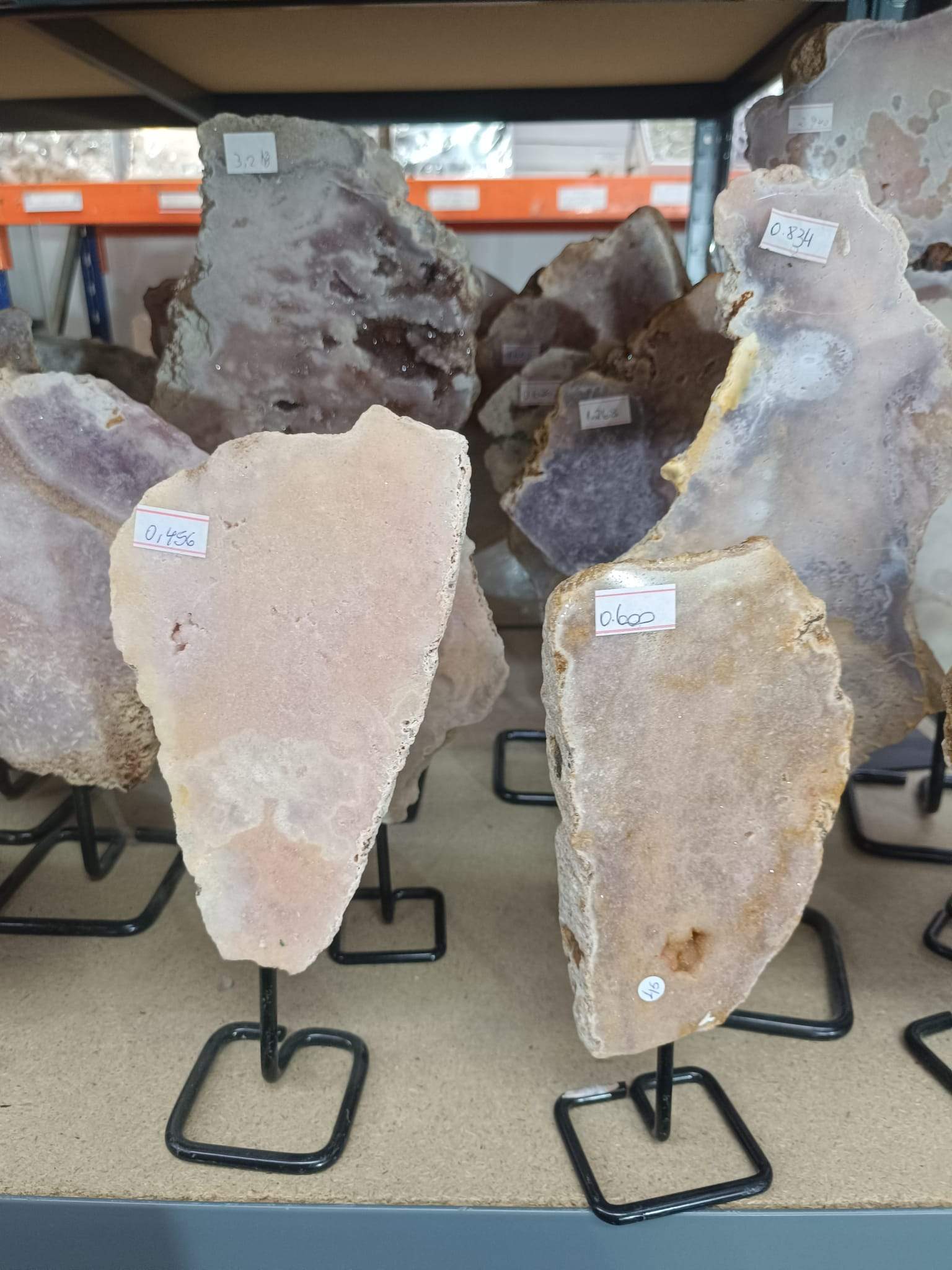 Pieza natural de amatista rosa montada sobre una base de metal resistente que realza su textura cruda y auténtica. Ideal para decoración, protección energética y espacios.