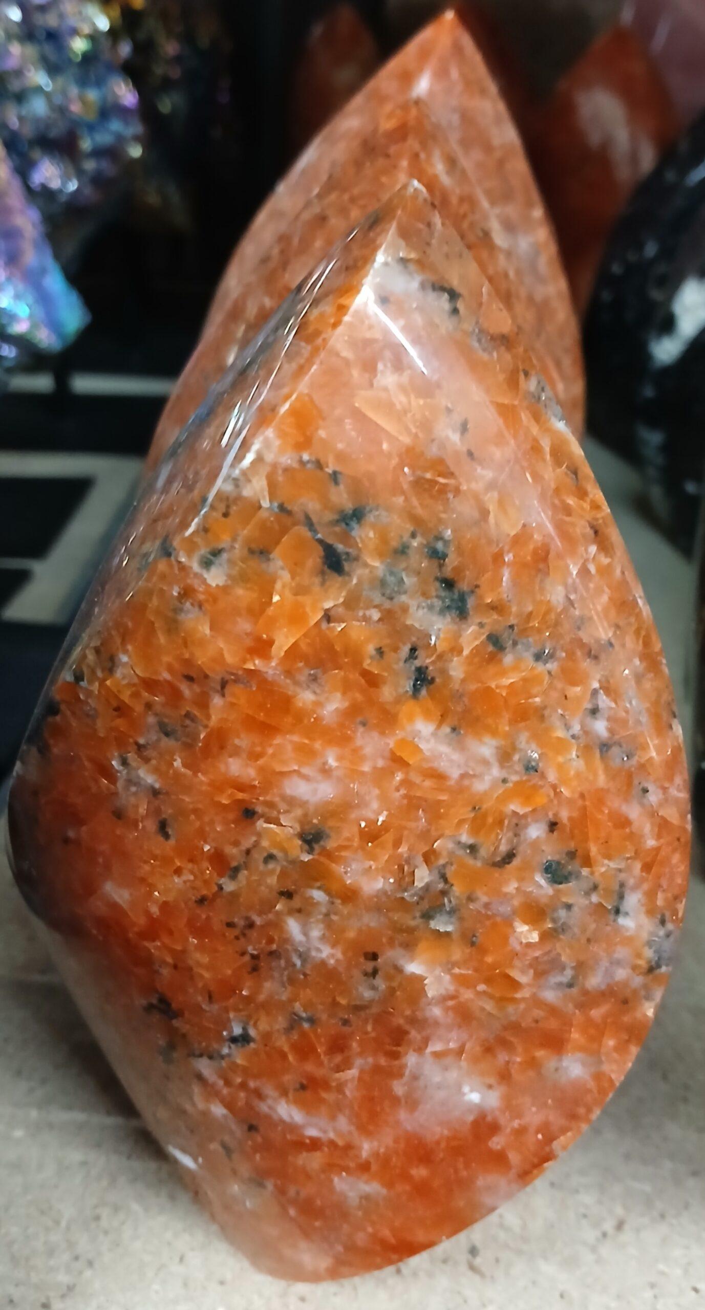 Calicta naranja pulida en forma de llama. Esta forma simboliza transformación y energía en movimiento, lo que la convierte en una excelente opción decorativa o energética para espacios que buscan protección y renovación. PERCIO/KG