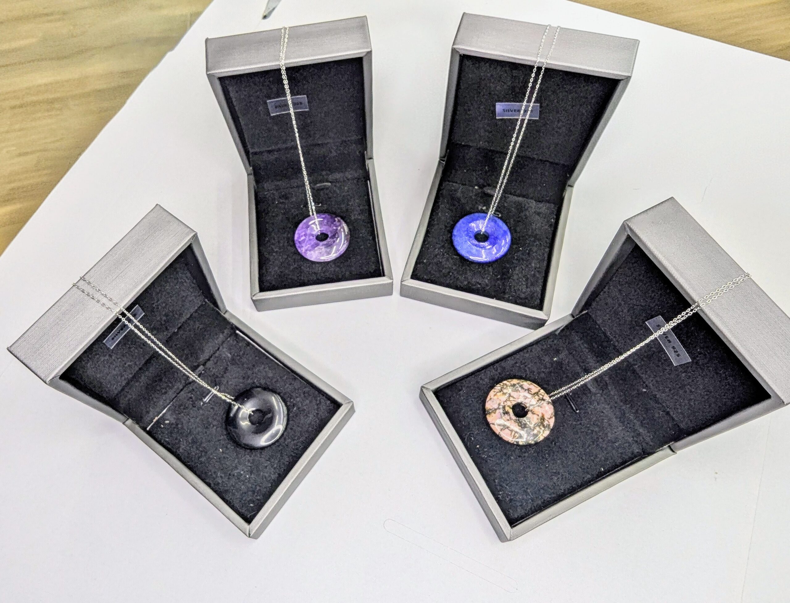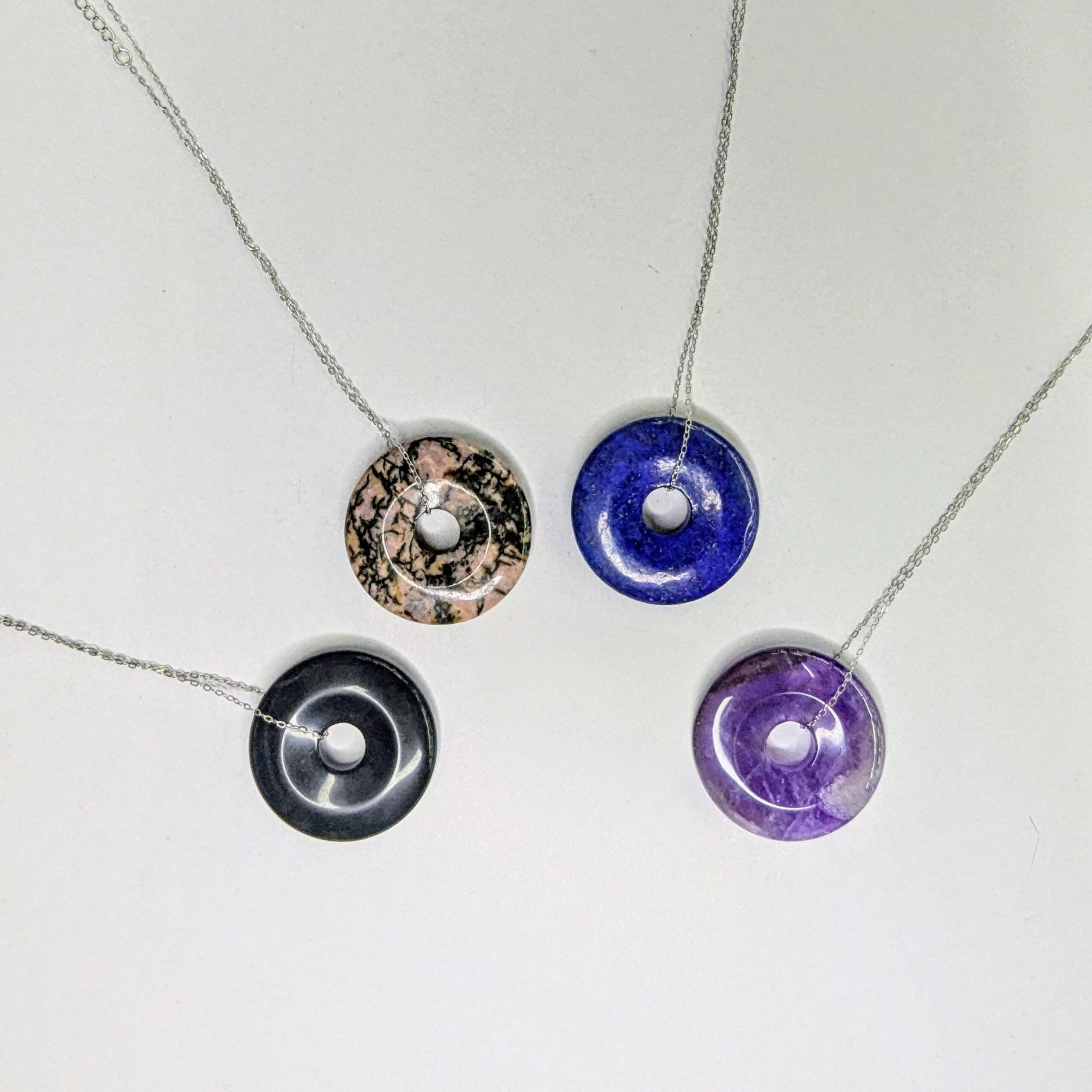Colgante tipo donut de piedra natural (amatista, lapislázuli, jaspe o hematita) con cadena incluida. Diseño minimalista y versátil. Se entrega con caja.