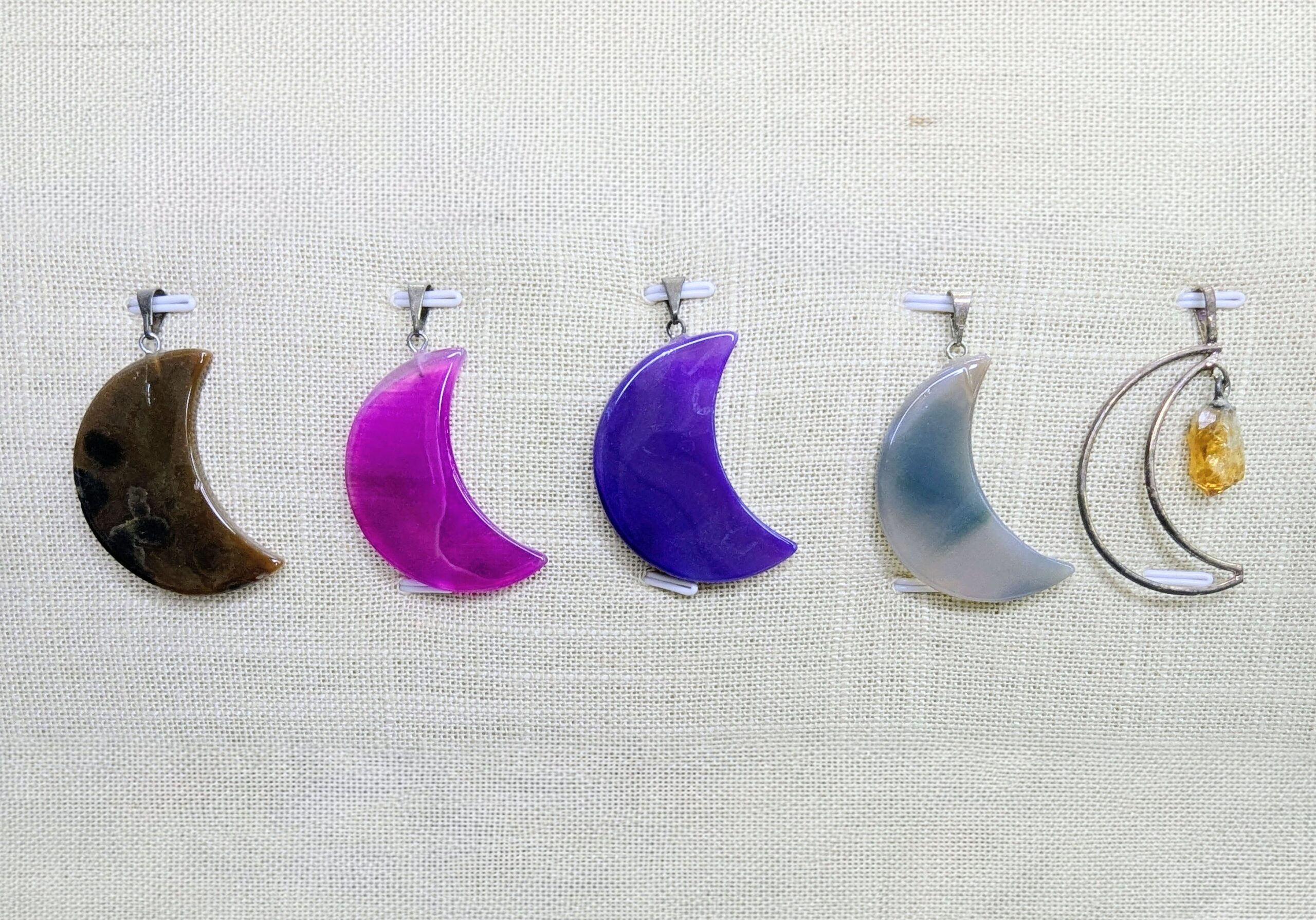 Colgantes con forma de luna en diferentes minerales y acabados (naturales y teñidos).