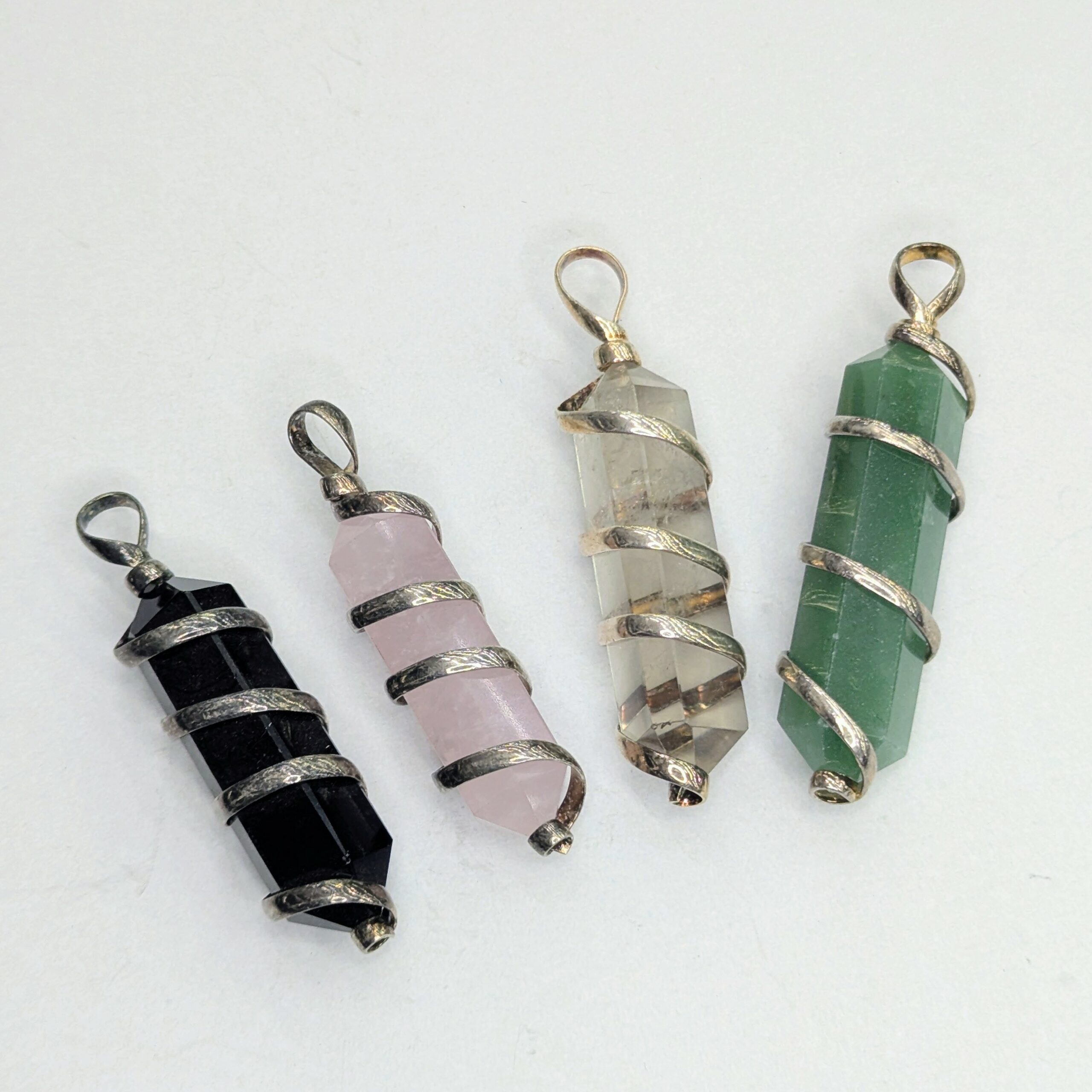 Colgantes de minerales tallados en punta y envueltos con espiral metálicade diferentes piedras (cuarzo, amatista, aventurina, ónix, etc.).
