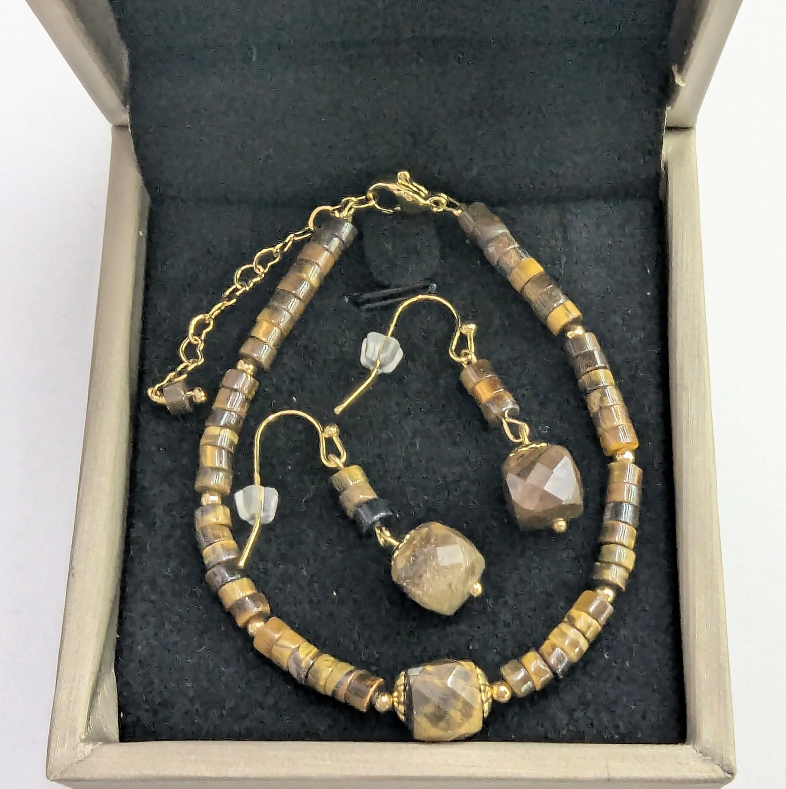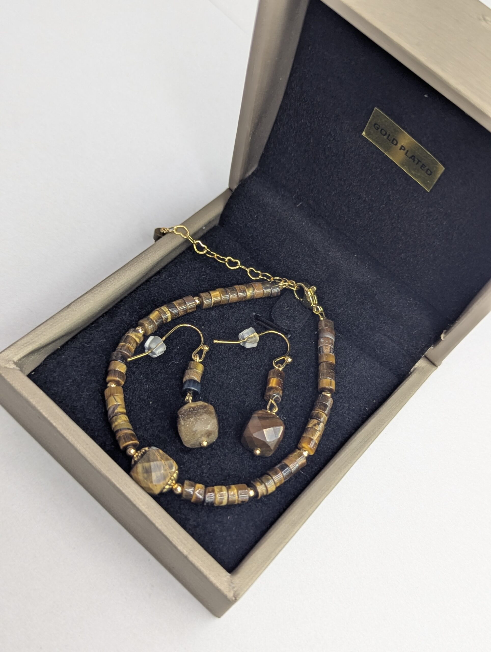 Conjunto de joyería con cuentas de ojo de tigre. Incluye collar, pulsera, pendientes a juego y caja.