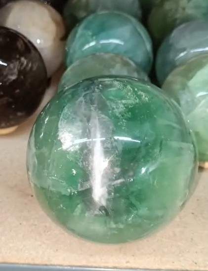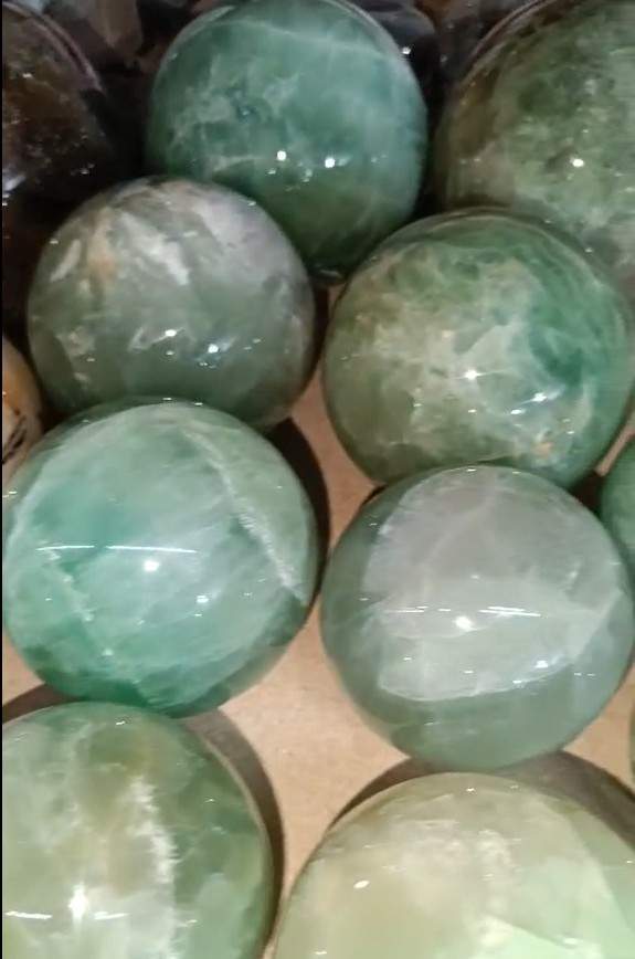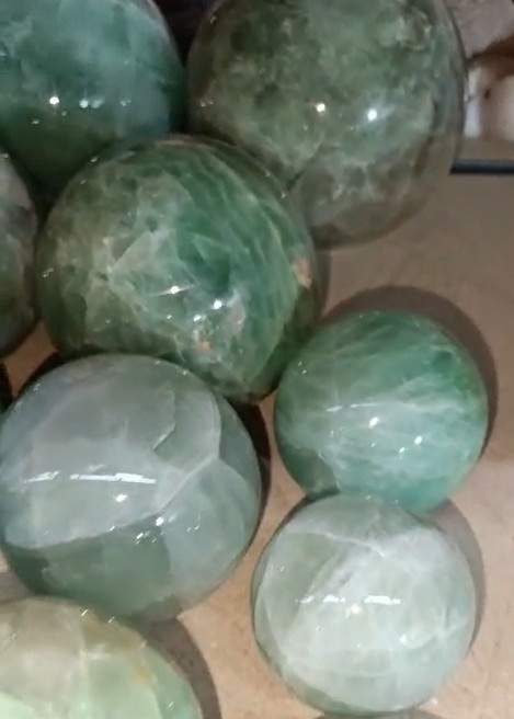 Esfera pulida de fluorita con tonos verdosos y vetas naturales. Cada pieza es única y combina estética con propiedades energéticas asociadas a la aridad mental, equilibrio y protección energética. Ideal para decoración, meditación o colección.