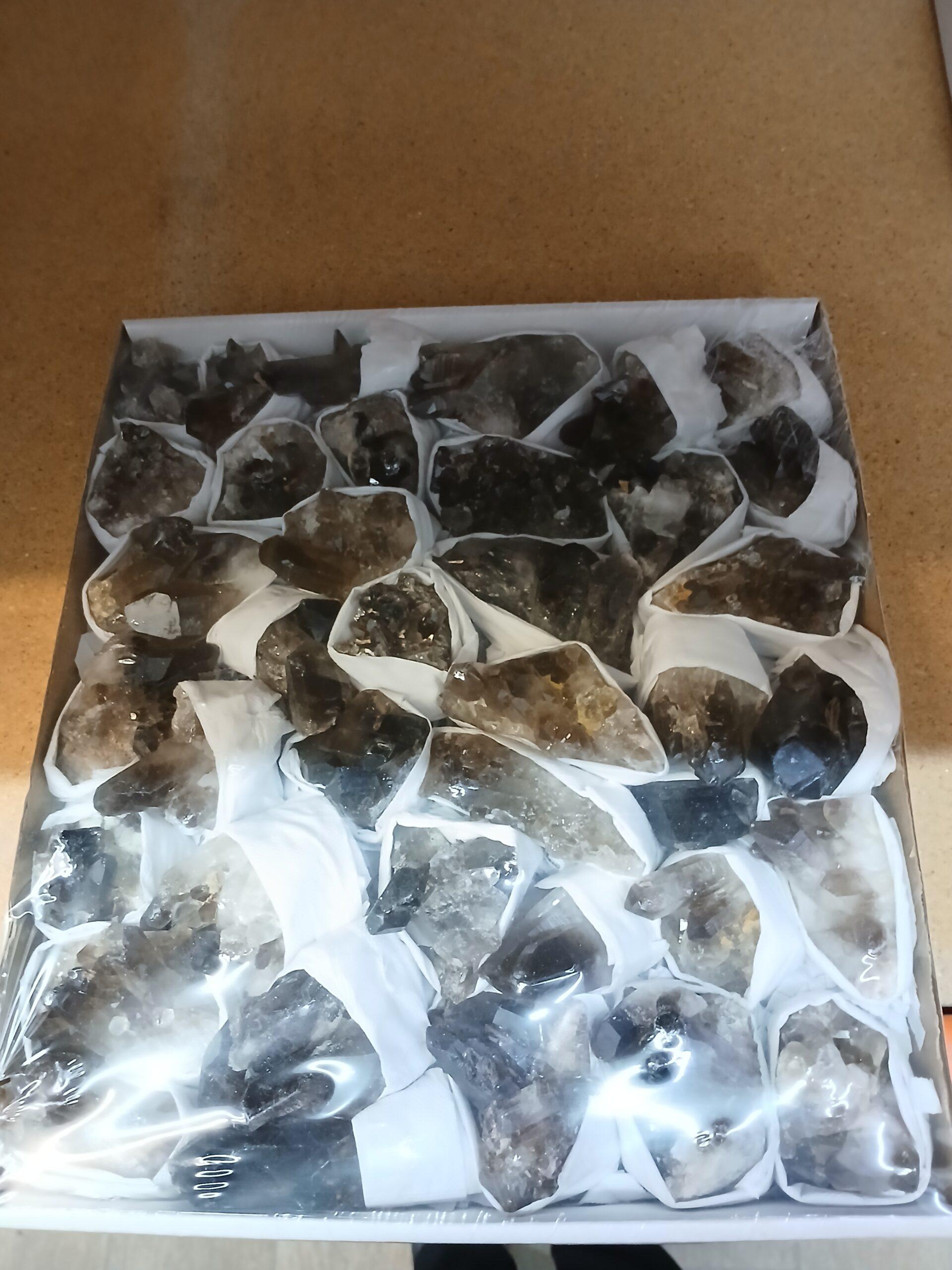 Selección de piezas de cuarzo ahumado natural. Presentan tonos que van del gris translúcido al marrón oscuro, con superficies cristalinas que muestran su estructura natural. Ideales para decoración, colección o uso energético enfocado en protección y equilibrio.
