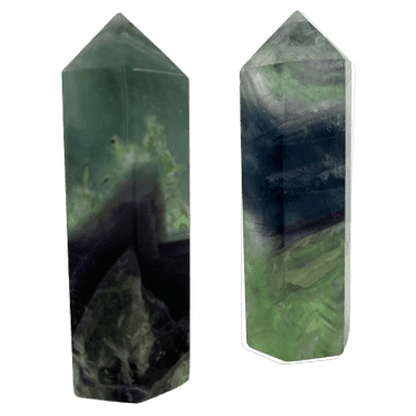 Prismas pulidos de fluorita con bellas combinaciones de colores como verde, violeta y azul. Cada pieza presenta vetas y transparencias únicas. Valoradas por su belleza natural y su energía asociada a la concentración y el equilibrio mental. Perfectas para colección, meditación o decoración.
