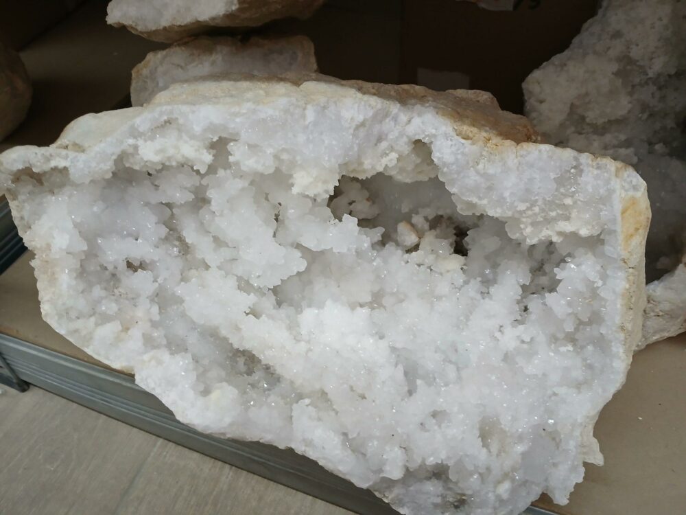 Geoda natural de cuarzo con cavidades internas repletas de cristales brillantes y translúcidos. Pieza unica, ideales para decoración, coleccionismo o para terapias energéticas y armonizar espacios.