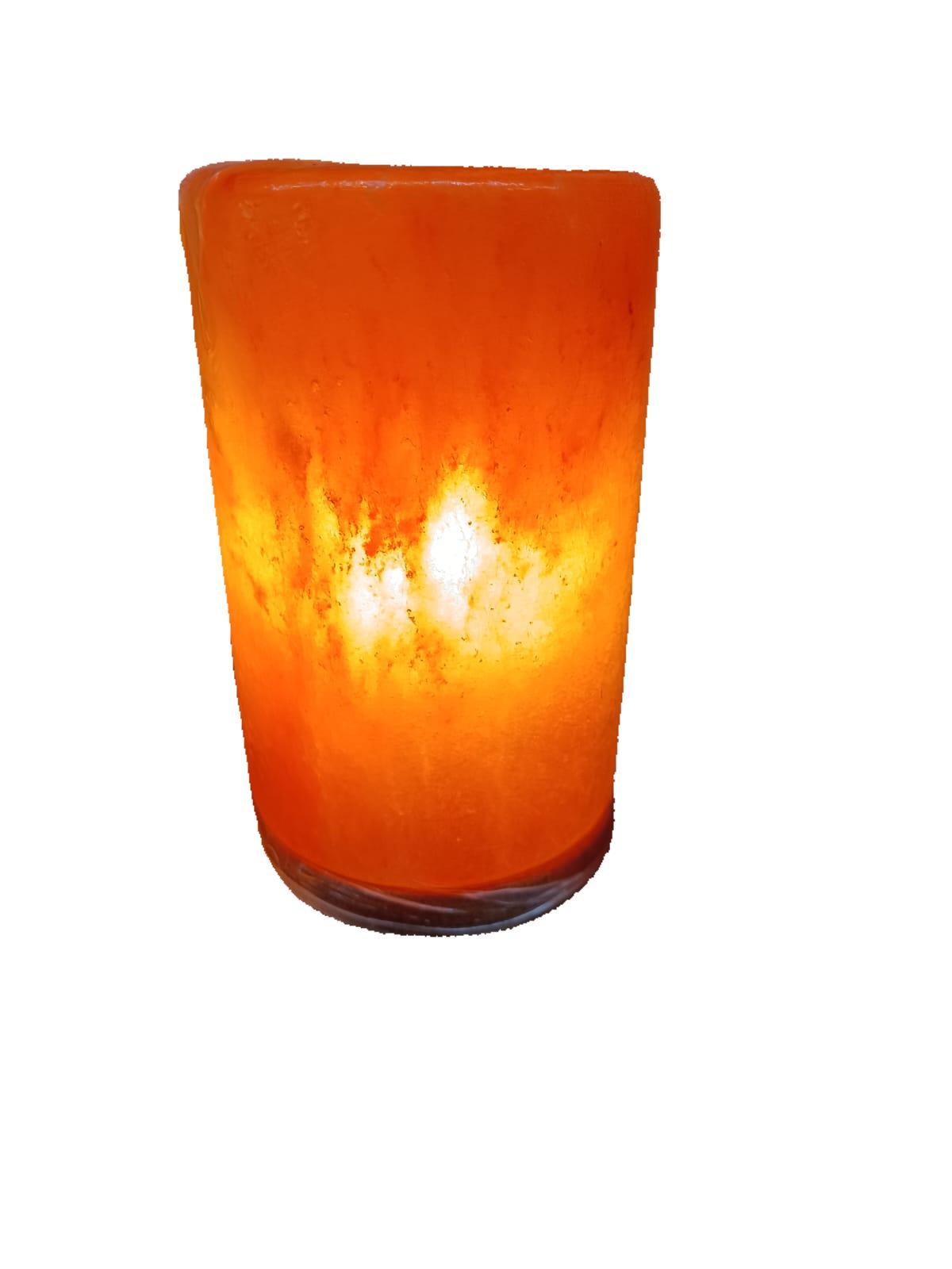 Lámpara de sal rosa del Himalaya tallada en forma de cilindro. Su luz cálida y tenue crea un ambiente relajante y acogedor, ideal para decorar y purificar cualquier espacio.
