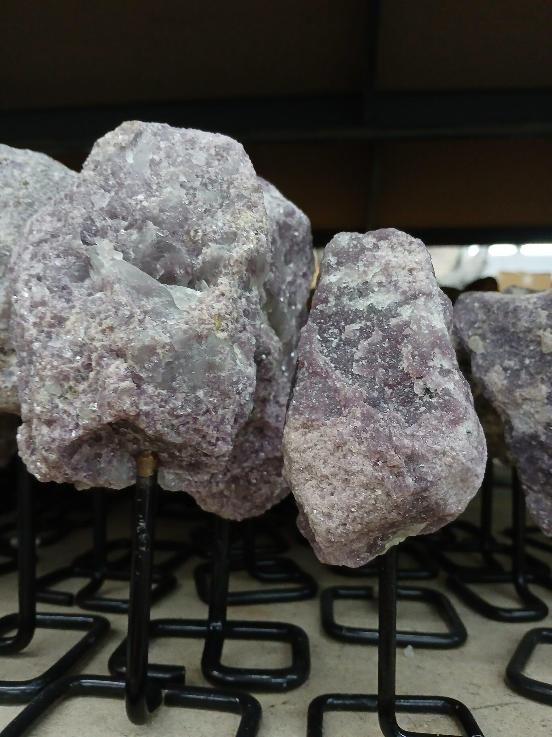 Pieza natural de lepidolita en estado bruto, montada sobre una base de metal resistente que realza su textura cruda y auténtica. Ideal para decoración, protección energética y espacios con estilo rústico y moderno. MIXBM1BT PRECIO/UNIDAD