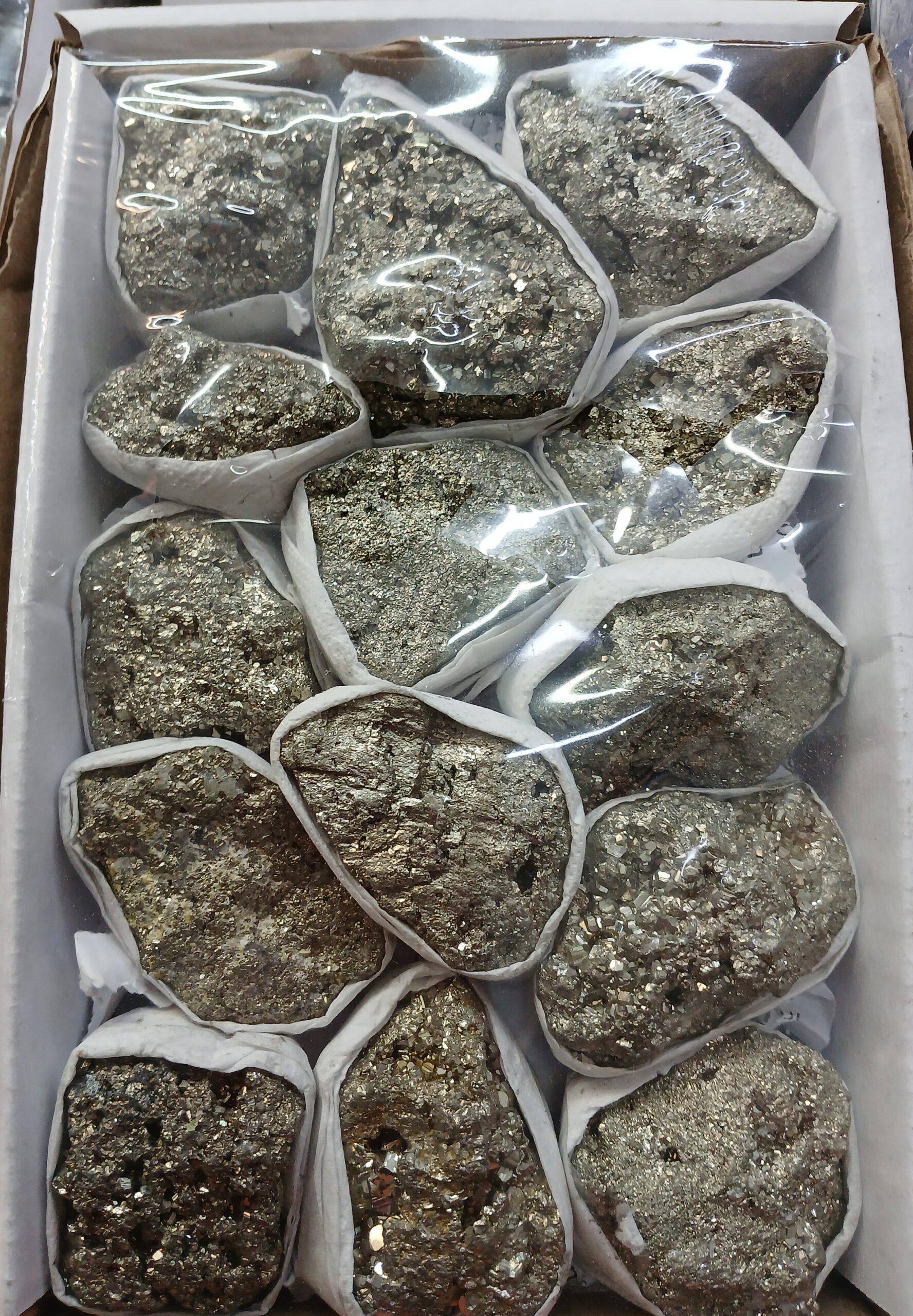 Selección de piezas naturales de pirita en estado bruto, con su característico brillo metálico dorado y formas cristalinas variadas. Presentadas en caja de 3 kg, ideales para coleccionistas, decoración o uso energético enfocado en la protección, la abundancia y la fortaleza del entorno. Venta por CAJA de 3 kg cada una.»