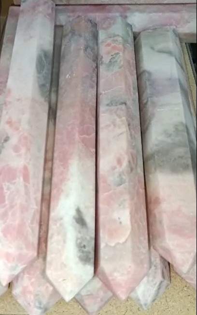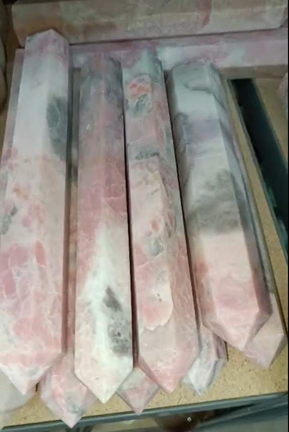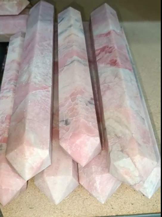 Prismas pulidos de rodonita con tonos rosados y vetas naturales. Cada pieza es única y combina estética con propiedades energéticas asociadas a la sanación emocional. Ideal para decoración, meditación o colección.