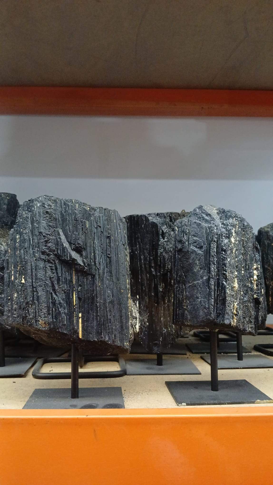 Pieza natural de turmalina negra en estado bruto, montada sobre una base de metal resistente que realza su textura cruda y auténtica. Ideal para decoración, protección energética y espacios con estilo rústico y moderno. venta por kg.